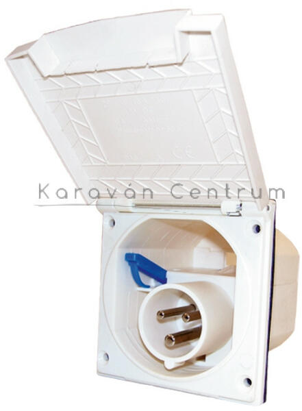Elektromos külső csatlakozóaljzat rugós fedéllel, melyet a következő járművek szereléséhez használnak: Chausson, Caravelair, Challenger, Sterckeman, Dethleffs, LMC, TEC 230 V / 16 A Kivágási méret: ø 92 mm Méret: 106 x 106 mm Beépítési mélység: 81 mm