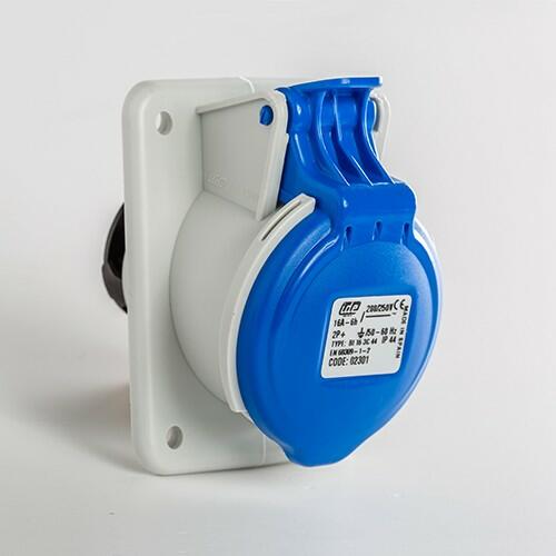 Beépíthető dugalj - Anyaga: műanyag - Méret: 90 x 83 mm - Beépítési méret: 76 x 70 mm/ furat méret: 52 x 65 mm - Névleges áram: 16A - Pólusok száma: 4P - (3P+E / 6h) - Névleges feszültség: 380V - IP védettség: IP44 - Típus: hagyományos, csavaros bekötésű, beépíthető ferde dugalj