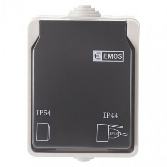 dizájn: SCHUKO|értékesítési csomagolás: 1 db, PE csomag|összeszerelés módja: falra|szín: szürke-fekete|termék: aljzat védőfedéllel|típus: 250 V~/16 A max. |típus: szimpla, vízálló|védettség: IP44
