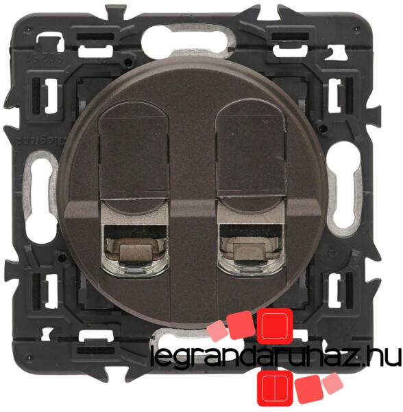 Céliane - dupla RJ45 (számítógép csatlakozó) aljzat A csomag tartalma: Céliane körmös rögzítőperem Céliane mechanizmus Céliane burkolat A termékkép az összeszerelt szerelvényt ábrázolja, a termékeket részekre csomagolva külön cikkszámon számlázzuk és szállítjuk (rögzítőperem + szerelvény + burkolat) Dupla számítógép csatlakozó aljzat LCS2 forgatókaros mechan
