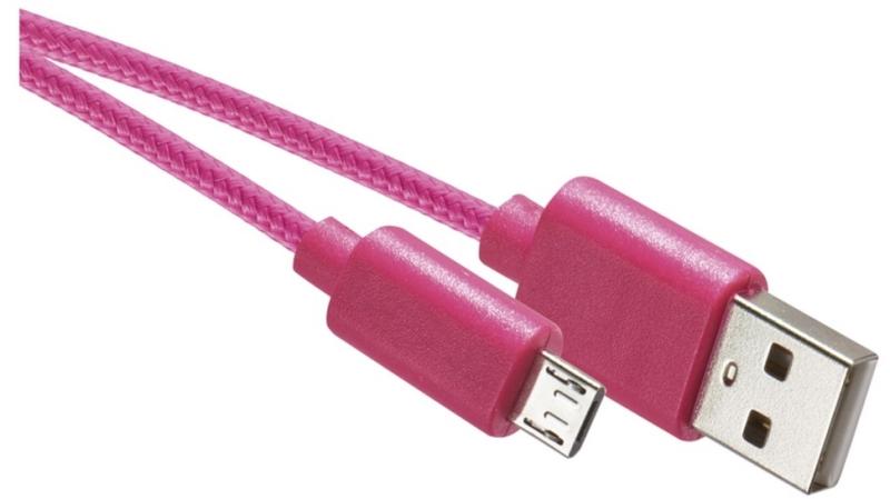 USB 2.0 A csatlakozó - USB B mikro csatlakozó. Kerek kivitelű, rózsaszínű USB-kábel (textilbevonat). Alkalmas mobiltelefonokhoz és más mobil eszközökhöz. USB kábel támogatással a 2 A-os gyors töltéshezAdatátviteli sebesség: 480 Mbit / s (nagy sebesség). Hossz: 1 m.