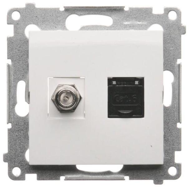 Aljzat 1 x SAT "F" + RJ45 kat. 6 Simon 54 prémium modul fehér Specifikáció: Sorozat: Simon 54 prémium Termék neve: 1 x SAT "F" + RJ45 kat. 6 aljzat Színe: Színe: 1,5 mm: Fehér Típus A csatlakozók típusa: "F" + rovátkolt kulcscsont IP-védelem: IP20 Porvédelem: igen Egyedi szereléshez Material type: Halogénmentes műanyag, PC Felületkezelés: fényes Szerelési mód: süllyesztett