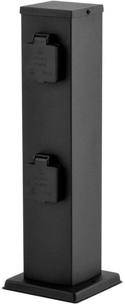Kültéri aljzatoszlop. 4 aljzat (kettő mindkét oldalon). Védettség IP44. Kiváló minőségű, tartós alumíniumból készült. Az aljzatok fölött elhelyezett patentok vízszigetelést biztosítanak a bemeneteknek, kiküszöbölve a rövidzárlatok kockázatát.