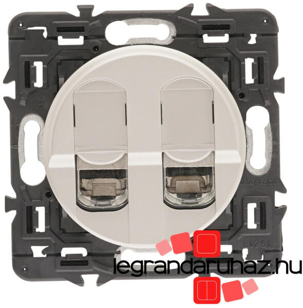 Céliane - dupla RJ45 (számítógép csatlakozó) aljzat A csomag tartalma: Céliane hosszított 37mm-es körmös rögzítőperem Céliane mechanizmus Céliane burkolat A termékkép az összeszerelt szerelvényt ábrázolja, a termékeket részekre csomagolva külön cikkszámon számlázzuk és szállítjuk (rögzítőperem + szerelvény + burkolat) Dupla számítógép csatlakozó aljzat LCS2