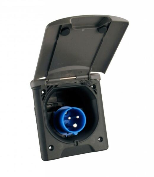 Elektromos külső csatlakozóaljzat rugós és mágneszáras fedéllel. UV - és csapódó víz elleni védelem (IP44) 230 V / 16 A Kivágási méret: ø 92 mm Méret: kb. 140 x 120 mm Beépítési mélység: kb. 81,6 mm Szín: sötétszürke