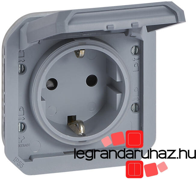 Plexo 55 - konnektor burkolattal Plexo 55 mechanizmus burkolattal Nem összeszerelt változat Földelt csatlakozóaljzat 16 A - 250 V~ Csavaros vezetékbekötés 2P+F csatlakozóaljzat biztonsági zsaluval Falon kívüli szereléshez kiemelődoboz, süllyesztett szereléshez keret szükséges Plexo 55 szürke Csatlakozás: Csavaros vezetékbekötés Kábel csupaszítási hossz: 12 mm Vezetékmére