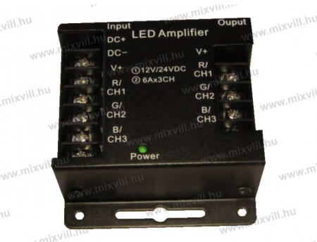Jelerősítő egység RGB LED vezérlőkhöz, ill. LED fényerő szabályzókhoz. A jelerősítő segítségével az RGB vezérlő vagy fényerőszabályzó maximális teljesítményét lehet bővíteni további 216W-al. - Feszültség: 12/24 V DC - Max. teljesítmény: 216 W - Csatornák száma: 3 - Max. áremerősség: 3x6A - RGB vezérlő méretei: 80 x 72 x 32 mm - Sorkapcsos bekötés
