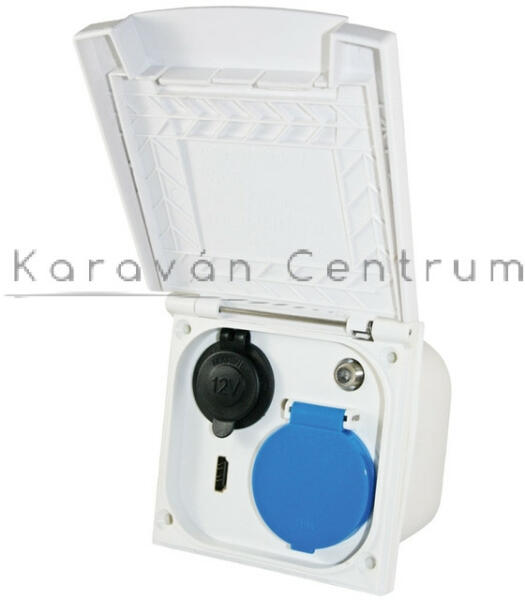 Elektromos külső csatlakozóaljzat fedéllel. Található benne 1-1 db 230 V-os és 12 V-os aljzat, továbbá HDMI és SAT csatlakozó Kivágási méret: ø Beépítési mélység: Szín: fehér