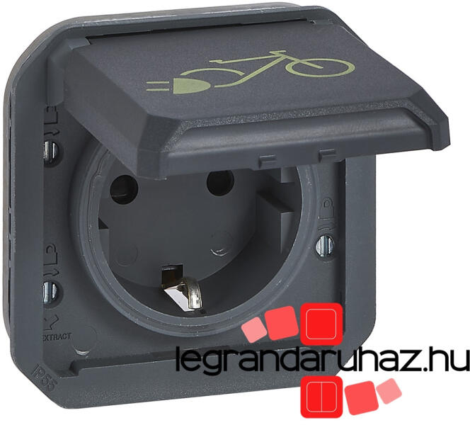 Plexo 55 - konnektor burkolattal kerépkárok töltéséhez Plexo 55 mechanizmus burkolattal Nem összeszerelt változat Földelt csatlakozóaljzat 16 A - 250 V~ Rugós vezetékbekötés 2P+F csatlakozóaljzat biztonsági zsaluval Falon kívüli szereléshez kiemelődoboz, süllyesztett szereléshez keret szükséges Rögzítési kiegészítő nélkül szállítva A csapófedélen kerékpár jelö