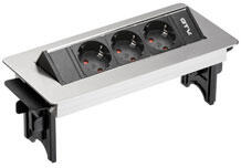 GTV Süllyeszthető rejtett elosztó, négyzet (3-as) inox, dugvillás Minőségi, szálcsiszolt fém felületű 3-as rejtett elosztó, melynek felnyitásához gomb sem szükséges, egyszerűen csak a fedlapot újjal le kell nyomni a feloldáshoz. Bútorlapba, konyhabútorba, pultba, munkaasztalba süllyeszthető hálózati elosztó, földelt, gyermekvédelemmel ellátott schuko konnektorokkal. Ki