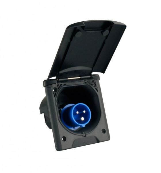 Elektromos külső csatlakozóaljzat rugós és mágneszáras fedéllel. UV - és csapódó víz elleni védelem (IP44) 230 V / 16 A Kivágási méret: ø 92 mm Méret: kb. 140 x 120 mm Beépítési mélység: kb. 81,6 mm Szín: fekete