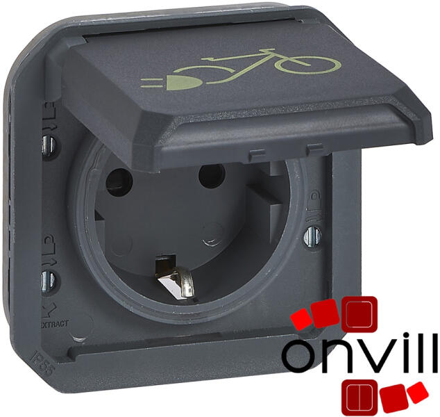 Plexo 55 - konnektor burkolattal kerépkárok töltéséhez Plexo 55 mechanizmus burkolattal Nem összeszerelt változat Földelt csatlakozóaljzat 16 A - 250 V~ Rugós vezetékbekötés 2P+F csatlakozóaljzat biztonsági zsaluval Falon kívüli szereléshez kiemelődoboz, süllyesztett szereléshez keret szükséges Rögzítési kiegészítő nélkül szállítva A csapófedélen kerékpár jelö