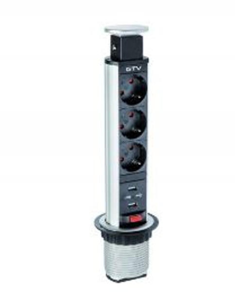 Iroda asztalba süllyeszthető elosztó Anyaga: Al + műanyag Méret: 315,1 mm x 54 mm Furat mérete: 60 mm Névleges feszültség: 220-240V/AC Névleges frekvencia: 50-60Hz Max. terhelhetőség: 3600W IP védettség: IP20 3 x ( 2P +F ) + 2x USB csatlakozó aljzat 1,5 m-es kábellel Színe: ezüst Érintésvédelem: I. Védelmi osztály
