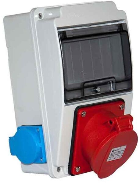 Ipari doboz szerelt 130x220 1x(5P32A) + 2x(2P+F) oldalsó IP44- Szerelt ipari doboz- Anyaga: műanyag- Méret: 130 x 220 mm- Oldallapon: 2db ( 2P+F ) háztartási dugalj- Előlapon: 1db ( 5P 32A ) beépíthető dugalj- Modul száma: 6- IP védettség: IP44