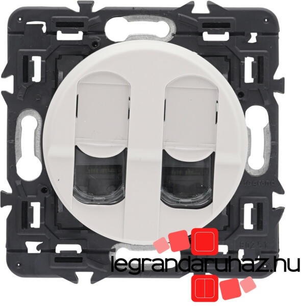 Céliane - dupla RJ45 (számítógép csatlakozó) aljzat A csomag tartalma: Céliane körmös rögzítőperem Céliane mechanizmus Céliane burkolat A termékkép az összeszerelt szerelvényt ábrázolja, a termékeket részekre csomagolva külön cikkszámon számlázzuk és szállítjuk (rögzítőperem + szerelvény + burkolat) Dupla számítógép csatlakozó aljzat LCS2 forgatókaros mechan