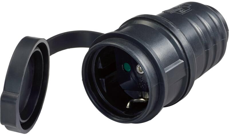 Az erős gumiból készült, fekete védőérintkezős lengőaljzat megbízható csatlakozórendszerként szolgál. Praktikus fedelének köszönhetőn az IP44 védelmi osztály szerint fröccsenő víztől védett, és ezáltal kültéri használatra is alkalmas. Emellett a kábel egyenes bevezetése érdekében a kábel megtörése elleni védelemmel is rendelkezik. Névleges feszültsége 230 V