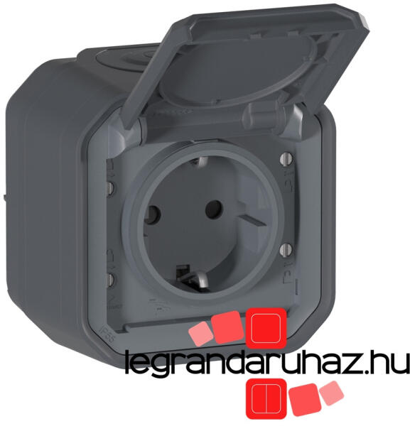 Plexo 55 - konnektor burkolattal kerépkárok töltéséhez Plexo 55 mechanizmus burkolattal és dobozzal Összeszerelt változat Földelt csatlakozóaljzat 16 A - 250 V~ Rugós vezetékbekötés 2P+F csatlakozóaljzat biztonsági zsaluval 1 membrános bemenettel Falon kívüli Rögzítési kiegészítő nélkül szállítva A csapófedélen kerékpár jelölés található Plexo 55 antracit Csatl