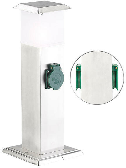 Kültéri kerti lámpa Áramerősség: 16 A / 3,500 W-ig terhelhető Fényforrás: E14 izzó, 40 wattig (A termék nem tartalmazza!) Fröccsenésálló: IP44 Biztonságos állvány: csavarokkal rögzíthető Anyag: rozsdamentes acél ház Tápellátás: 230V (csatlakozás 3 vezetékes tápkábelhez) Méretek: 16x40,5x16 cm Súly: 1,59 kg További információk:Kültéri lámpa dupla kondektorral K