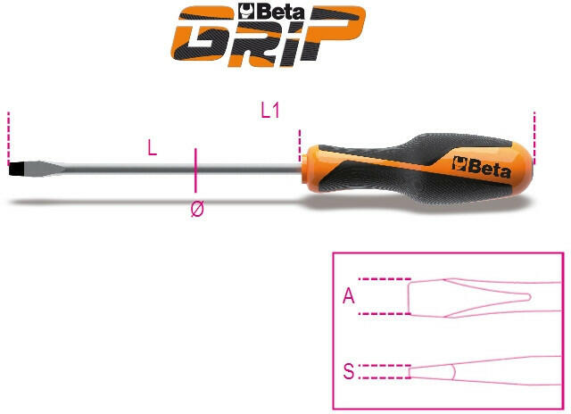 A KÉP CSAK ILLUSZTRÁCIÓ! JELLEMZŐK: Csavarhúzó BetaGrip TECHNIKAI SPECIFIKÁCIÓK: SxAxL mm2x12x250 L1 mm377 ? g266,6 Ø mm10
