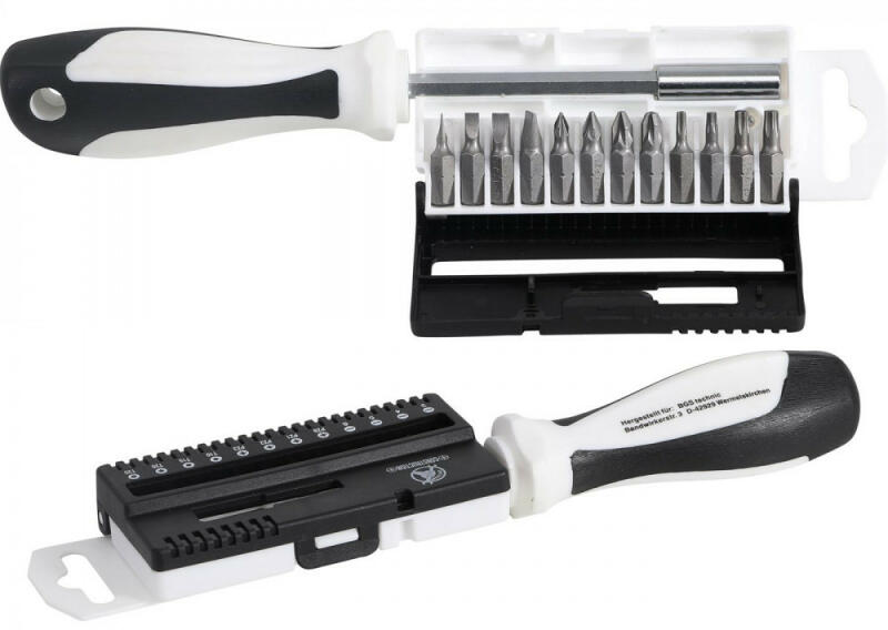 Kényelmesen és sokoldalúan használható csavarhúzó ergonomikus markolattal. Praktikus, csavarhúzóra rögzíthető bit tartó doboz. Bitek:3 db lapos fejű bit: 3 - 4 - 5 - 6 mm3 db kereszthornyú bit: PZ 0 - 1 - 2 - 33 db Torx bit: T 10 - 15 - 20 - 25A Kraftmann termékeinket szintén a német BGS Technic® gyártócég állítja elő, árban azonban még kedvezőbb alternatívát jelent a