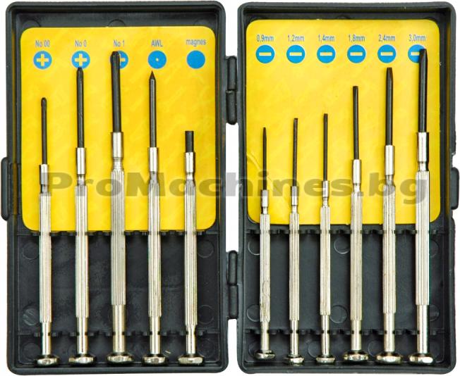 Órás csavarhúzó készlet Órás csavarhúzó szett fém nyéllel, 11 db-os. Forgó ujjtámasszal ellátott végű nyéllel. Műanyag tartóban. A szett tartalma: AWL pontozó Mágneses kiszedő csavarhúzók: lapos (SL) 1 mm lapos (SL) 1.2 mm lapos (SL) 1.4 mm lapos (SL) 1.8 mm lapos (SL) 2.4 mm lapos (SL) 3 mm PH 00 PH 0 PH 1