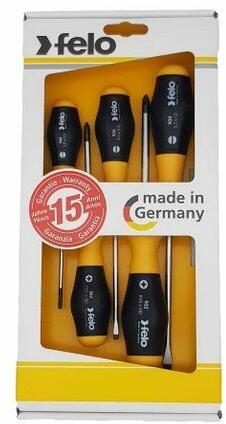 FELO Torx csavarhúzó készlet, különösen nagy igénybevételre tervezett, kétkomponensű markolattal. Méretei: T10-T30 Penge Anyaga: króm-molibdén-vanádium acél ötvözet. Felületkezelés: krómozott, a hegy bevonat nélküli a pontos méret és illeszkedés érdekében.