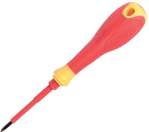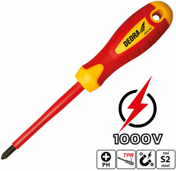 Tanúsított villamos szigeteléssel ellátott csavarhúzó, legfeljebb 1000 V váltóáramú, vagy 1500 V egyenáramú feszültség alatt végzett munkához. A német VDE intézet által tesztelt termék. Megfelel az IEC/EN 60900-2004 szabvány követelményeinek. Méret: PH0 x 75 mm Anyaga: acél Polipropilén és gumi markolat VDE: Vizsgálati és tanúsító intézet, mely országos és nemzet