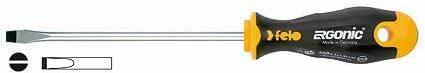 FELO Lapos csavarhúzó hornyos csavarokhoz, ERGONIC markolattal. Az egyetlen markolat, melynek a belsejében lévő zselés cella alkalmazkodik a felhasználó tenyeréhez, a maximális nyomaték kifejtése mellett, egyedülállóan kényelmessé teszi a munkavégzést. Méretei: hegy szélessége: 8,0 mm, hegy vastagsága: 1,2 mm, penge hossz: 175 mm, penge átmérője: 7,0 mm teljes hosszban, m