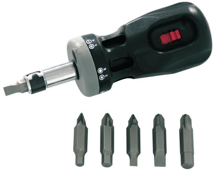 3 pozíciós racsnis csavarhúzó hajtószár Acél klip a bitfejek rögzítéséhez 6 db. kétoldalas bitfej a fogantyúban tárolva: - PH1 - lapos(egyenes) 4 mm - PH2 - lapos(egyenes) 5 mm - PZ1 - HEX 4 mm - PZ2 - HEX 5 mm - T10 - T15 - T20 - T25