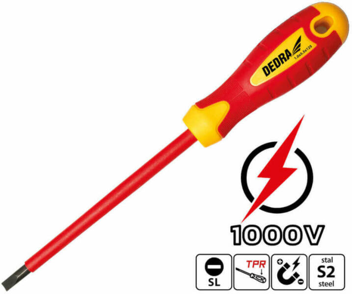 Teljesen szigetelt csavarhúzó VDE tesztelt 1000 V-ig. Professzionális nagy tapadású markolat, mágneses él, króm-vanádium acélból készült penge. Az egyenes hornyú csavarok a legszélesebb körben használt rögzítőelemek. A csavarok biztos meghajtásához fontos, hogy a csavarhúzó szélessége megegyezzen a csavarfej szélességével. Így elkerülhető a csavarfejek eltorzítása