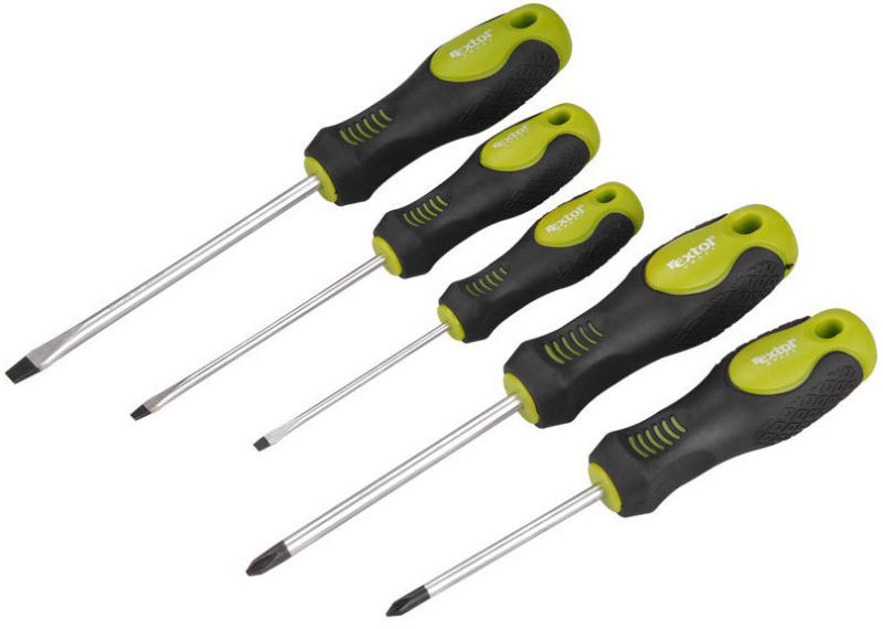 Extol Csavarhúzó készlet, 5 db, CrV, mágneses, 3db lapos:3×75mm, 4×100, 6×125mm; 2 db PH: PH1×75mm , PH2×100mm, papír tartóban. 3 db lapos csavarhúzó: 3×75mm, 4×100, 6×125mm, 2 db PH csavarhúzó: PH1×75mm , PH2×100mm, (a hosszak a szárhosszak) 2 komponensű TP+TPR gumis, csúszásgátlós nyél Papír dobozban