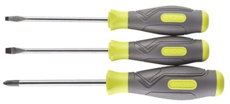Mágneses hegyű csavarhúzó készlet gumi fogantyúval. A készlet 1 100 mm-es PH2, 1 100 mm-es SL5,5 és 1 100 mm-es SL4 csavarozót tartalmaz.