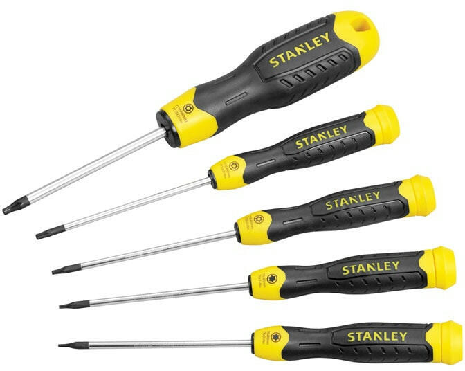 STANLEY TORX CSAVARHÚZÓ KÉSZLET 5DB-OS Ergonómikus kialakítású bimateriál nyél Mágneses csúcs a könnyű összeszereléshez Lekeskenyített nyakrész a gyors forgathatósághoz króm-vanádium acélötvözet Akasztó lyuk a könnyű tároláshoz A csomag tartalma Stanley Torx TT5 csavarhúzó Stanley Torx TT6 csavarhúzó Stanley Torx TT8 csavarhúzó Stanley Torx TT10 csavarhúzó Stan