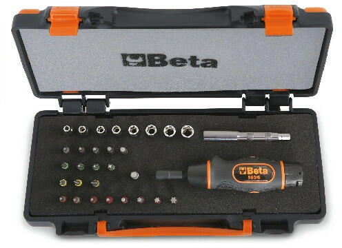 BETA 583/C31 1 db nyomatékcsavarhúzó, 8 db hatlapú dugókulcs, 20 db csavarhúzóbetét és 2 db tartozék fémdobozban hőformált tálcában 583/6 1.2 - 6 Nm 900 1/4"-os hatlapú dugókulcs 4-5-5,5-6-7-8-9-10 mm 860LP Színes csavarhúzóbetét hasítottfejű csavarokhoz 0,6x4,5 - 1x5,5 - 1,2x6,5 mm 860PH Színes csavarhúzóbetét Phillips®-csavarokhoz PH1 - PH2 (x2) - PH3 860PE Színes ha