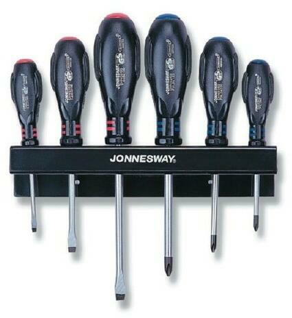 Jonnesway Tools - USA 6 db-os készlet, falra szerelhető fém taróval Méretek: lapos: 4x80, 6,5x100, 8x150 kereszt PH 3x125, 2x100, 1x80 erős mágneses vég, nyomás, olaj és saválló nyél DIN 5262; DIN 5265 standard