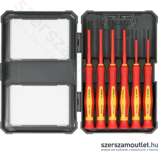 YATO YT-28283 Precíziós csavarhúzó készlet Precíz VDE szigetelésű csavarhúzó készlet strapabíró hegyekkel, S2 acélból. K étkompozit markolat, 95 mm hosszú, kemény és tartós polipropilénből és kellemesen használható hőre lágyuló gumiból. S zigetelt csúcsok S2 acélból, forgatható fej a nyomásos munka megkönnyítése érdekében. VDE tanúsítvány, amely megerősí