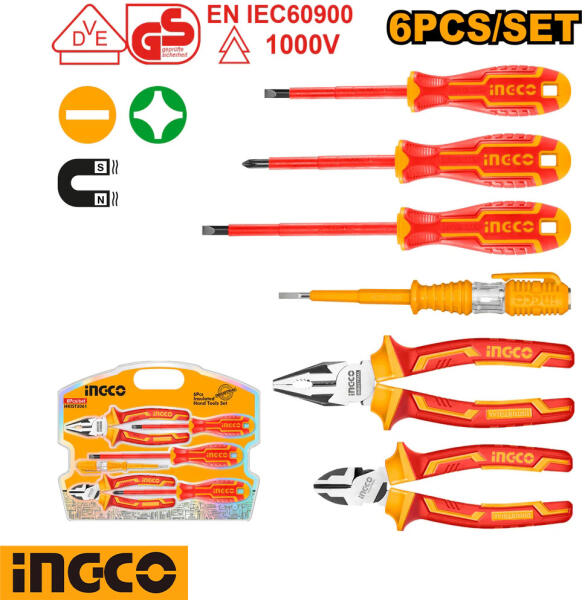 Szigetelt fogó és csavarhúzó készlet, 6 részes SL4-SL5.5 szigetelt lapos csavarhúzó PH2 szigetelt csavarhúzó Fázisceruza 100-500V 160 mm szigetelt oldalcsípő fogó 180 mm szigetelt kombinált fogó VDE 1000V 2K markolat Szigetelt fogó és csavarhúzó készlet, 6 részes 2K markolat VDE 1000V EN IEC60900 Készlet tartalma: SL4x100 szigetelt lapos csavarhúzó SL5,5x125 szigetelt lapo