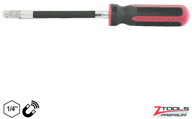 Flexibilis bit csavarhúzómarkolat 1/4" bit befogás Ergonomikus kialakítású, kémiailag semleges, kétkomponensű markolat. Csúszásbiztos kivitel. Gumibevonatos, flexibilis, kettős rugóspirálból felépülő szár. Hosszú és extra hosszú, flexibilis vezetőszárral. Golyós rögzítéssel.