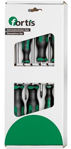 Csavarhúzó készlet Kerek penge Krómozott Króm-vanádium acél Fekete hegy Többkomponensű műanyag markolat Elgurulás elleni védelem Szállítás: Ablakos kartondobozban. Tartalom: 4 lapos csavarhúzó 3 | 4 | 5,5 | 6,5 mm 2 kereszthornyú csavarhúzó PZ 1 | PZ 2