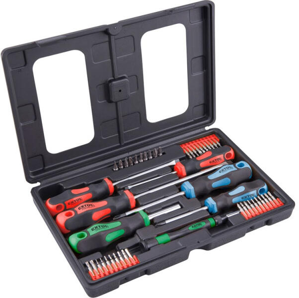EXTOL® PRÉMIUM 47db-os Csavarhúzó és BIT készlet, Chrome Vanádium, műanyag tartóban (8819258) Termék tualjdonságok: - Ergonómikus, percíziós markolattal ellátva - Összecsukható műanyag tartó dobozban A csomag tartalma - Lapos csavarhúzó (3db): 3,5×75mm; 5,5×100mm; 6,5×150mm - Csillag csavarhúzó PH (4db): PH1×75mm; PH2×100mm - 1/4'' BIT-ek (10db): 3db lapos, 4db csillag,