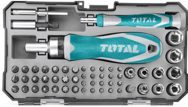 55 darabos csavarhúzó bitkészlet (TACSD30556) A 55 darabos TOTAL TACSD30556 multifunkciós készlet ideális otthoni, javítási, építési, összeszerelési, és szétszerelési munkához. Hatékony munkavégzést tesz lehetővé az SL, PZ, PH, Hex, Torx önfeszítő fogakhasználata. A készlet magában foglal egy magas minőségű csavarhúzótforgómechanizmussal, két bit-tartót, egy bit