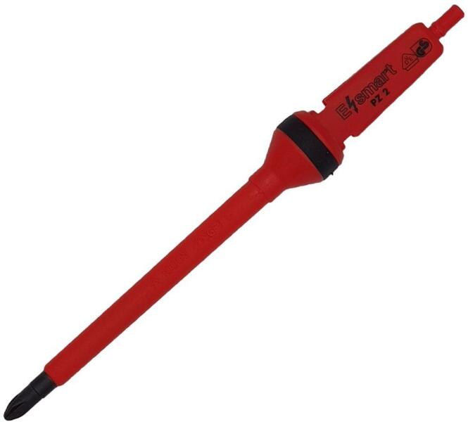 Felo FELO E-SMART szigetelt csavarhúzó penge. A kupak eltávolítása után behelyezhető az E-SMART markolatba így normál szigetelt csavarhúzóként használható. Alkalmazható: pozidrive típusú, általában facsavarokhoz. A csavarhúzó 1000 voltig használható. Minden darab 10.000 volttal tesztelt, megfelel az EN60900 szabványnak. Méretei: PZ1, penge hossza: 80 mm. Penge Anyaga: kró
