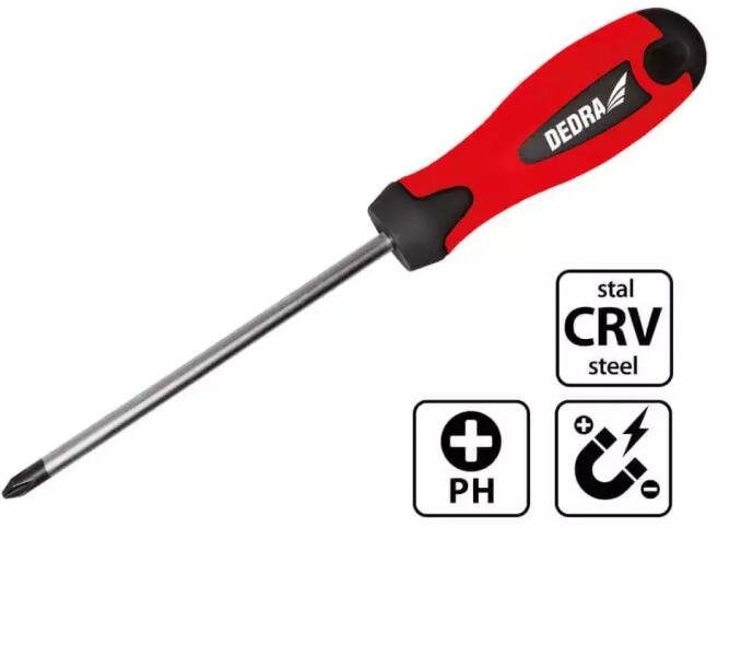 Ph2 x38mm Phillips csavarhúzó. A penge krómötvözetből készült, amely rendkívül ellenálló a korrózióval szemben. Ezenkívül a hegye mágnesezett, ami növeli a pontosságot és megkönnyíti a csavarhúzó használatát. Profilált markolat, gumírozott a jó fogás érdekében. Jellemzők:PH2 csavarhúzó méret Csavarhúzó hossza 38 mm Krómacélból készült-CrV Mágneses hegy M