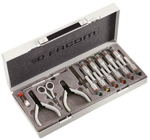 A Facom Microtech szerszámkészlet csavarhúzókat, fogókat, fogókat, csipeszeket és ollókat tartalmaz.