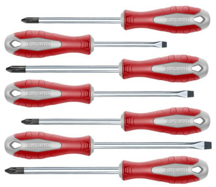 FORTUM csavarhúzó klt. , 7db; lapos: 3×75, 5×100, 6×125mm, PH1×100, PH2×125, PZ1×100, PZ2×125, CV. mágneses, papír doboz