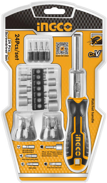 1/4" 25 mm bithegy: SL3, SL4, SL5, SL6, Sl6, Sl7, PH1, PH2, PH2, Ph3, PZ1, Pz2, T10, T15, T20, T25 1/4" csavarbehajtó: 5 mm, 6 mm, 7 mm, 8 mm, 9 mm, 10 mm, 11 mmEgyedi markolat Szállítási terjedelem: 16 db bithegy, 7 db csavarbehajtó, 1 db racsnis csavarhúzó, Bliszterben
