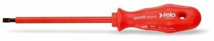 FELO lapos szigetelt csavarhúzó hornyos csavarokhoz. A markolatban található furat segítségével könnyen tárolható a szerszám és egy másik FELO csavarhúzó segítségével extra nyomaték érhető el. A csavarhúzó 1000 voltig használható. Minden darab 10.000 volttal tesztelt, megfelel az EN60900 szabványnak. Méretei: hegy szélessége: 6,5 mm, hegy vastagsága: 1,2 mm, penge hos