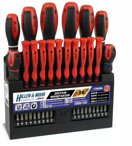 a 17W096 36 darabos csavarhúzó és bit készlet kiváló választás bármely műhely vagy garázs felszereléséhez. A Hillen&Mohr csavarhúzói S2 acélból készülnek, ami garantálja a csavarhúzók megfelelő működését anélkül, hogy a munkahegy vagy a csavarhüvely sérülésétől kellene tartani. A formázott markolat műanyagból készült és mosható. Ez a kombináció kény