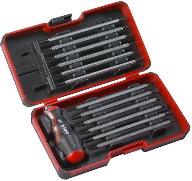 A legokosabb csavarhúzó készlet. 72 funkció egy 13 részes profi készletben (24 db csavarhúzó vég, 24 féle T-kulcs vég és 24 csavarbehajtó bit egy dobozban). - csúszásmentes, ergonomikus markolat, amely akár 65 Nm nyomatékot is elvisel - 160 mm hosszú szárak / 105 mm hosszú markolat - 72 funkció - csatlakozás: 1/4" (6.3 mm) - meghaladja a DIN és ISO szabvány követelményeit
