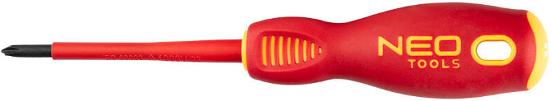 A NEO SL/PH1 x 80 mm-es, 1000 V-os csavarhúzója, cikkszáma: 04-218, 1000 V-ig terjedő feszültség alatti munkavégzésre jóváhagyott szerszám. A csavarhúzó hegye, szára tartós S2 acélból készült. A munkahegye hőkezelt, ami megfelelő keménységet és hajlításállóságot eredményez. A speciális hegy SL/PH1 méretű és 80 mm hosszúságú. A markolat háromszög alakú, ergon